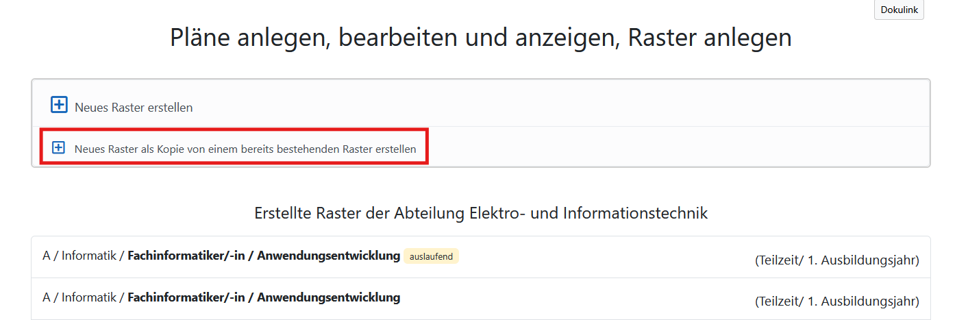 Klicken Sie auf den Beruf/Bildungsgang, für den Sie ein Raster anlegen wollen.