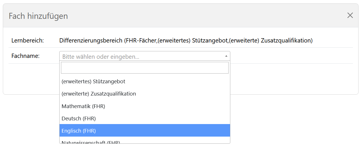 Wählen Sie ein FHR-Fach aus der Auswahlbox aus und klicken dann auf den Button “Hinzufügen”.